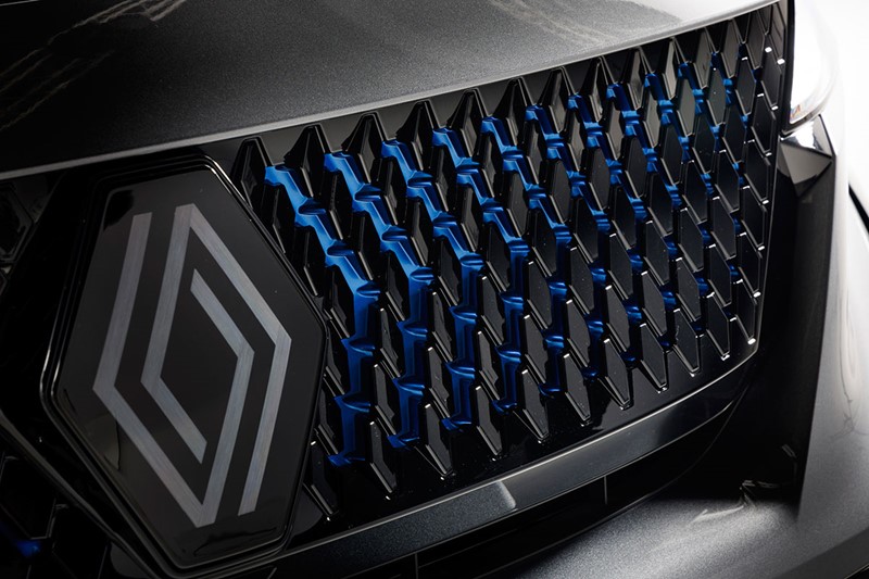 Sprijeda se ističe nova maska ugrađena oko prepoznatljivog dijamantnog logotipa. Izrađena je od niza malih dijamanata koji stvaraju trodimenzionalni učinak oko središnjeg amblema. Dijamantni uzorak sjajno crne boje posveta je maskama koje su u prošlosti krasile skupocjena vozila. Uzorak je postavljen na površinu plave boje ili sive boje Shale (ovisno o inačici) koja je, po uzoru na optičku umjetnost iz sedamdesetih godina, vidljiva samo onda kada se promatra iz pravog kuta. Riječ je o Renaultovoj posveti Victoru Vasarelyju, znamenitom predstavniku pokreta optičke umjetnosti čije je prezime upisano u Renaultovu povijest. Naime, 1972. godine Victorov sin Yvaral dizajnirao je logotip koji je poslužio kao predložak za novi dinamični logotip Nouvel’R.