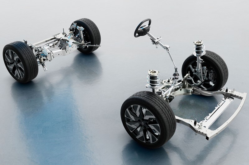 U usporedbi s Australom i novim Espaceom, također opremljenima multi-link stražnjim ovjesom i sustavom 4Control Advanced, Rafale uključuje i tehnologiju nadzora kretanja vozila VMC 2. To je unaprijeđeni elektronički sustav koji upravlja stražnjim kotačima te preciznije predviđa gubitak prianjanja. Zahvaljujući njemu, vozači mogu lakše i brže svladati zavoje te znati da će svi kotači biti u optimalnom položaju na neravnim i oštećenim cestama. Novi Rafale ima za 4 cm širi trag kotača od novog Espacea, veće kotače (245 mm) i specifične postavke opruga, amortizera i stabilizatora koje pridonose udobnosti i dinamičnosti.
